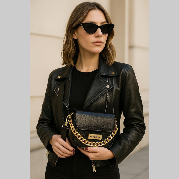 Cartera de cuero charolado con herrajes en dorado. Cierre en color oro principal y en dorso Cadena para lucir o para llevar en la mano. Asa bandolera de cuero de 4 cm de ancho y 1 mt de largo. Forro: Algodón 100%.