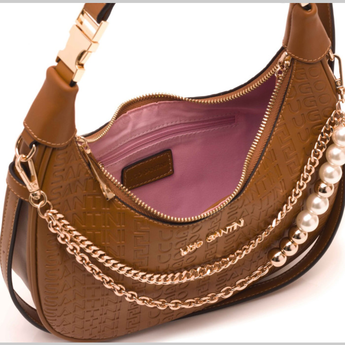 Cartera cuero sintético gofrado con logo de la firma. Herrajes color oro y cadenas con perlas en frente del producto. Asa de hombro en cuero sintético.