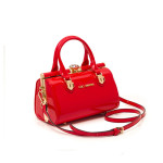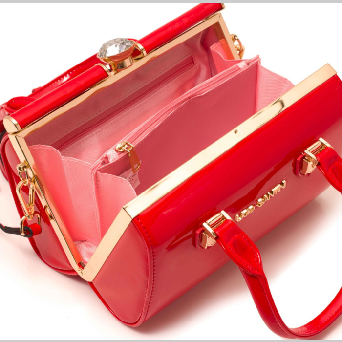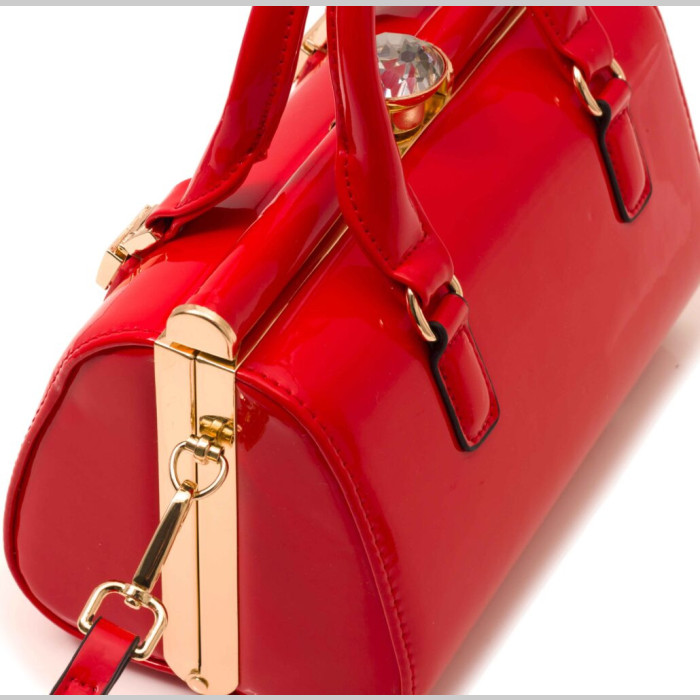 Cartera cuero sintético charolado con logo de la firma. Herrajes color oro con cierre fantasía. Asa de hombro y correa extraíble en cuero sintético con metal .