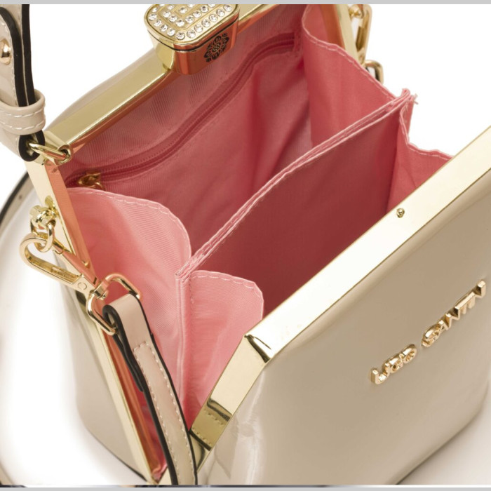 Cartera cuero sintético charolado con logo de la firma. Herrajes color oro con cierre fantasía. Asa de hombro y correa extraíble en cuero sintético con metal .