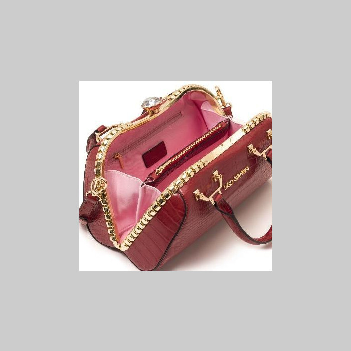 Cartera cuero sintético gofrado con broche importante a presión. Herrajes y cadenas color oro. Asa de hombro y desmontable combinada con cadena oro.