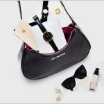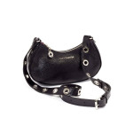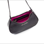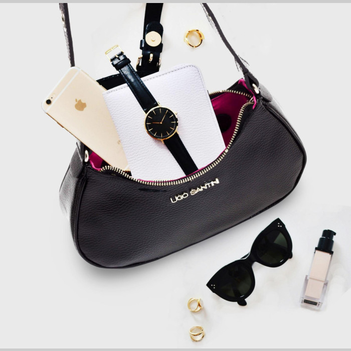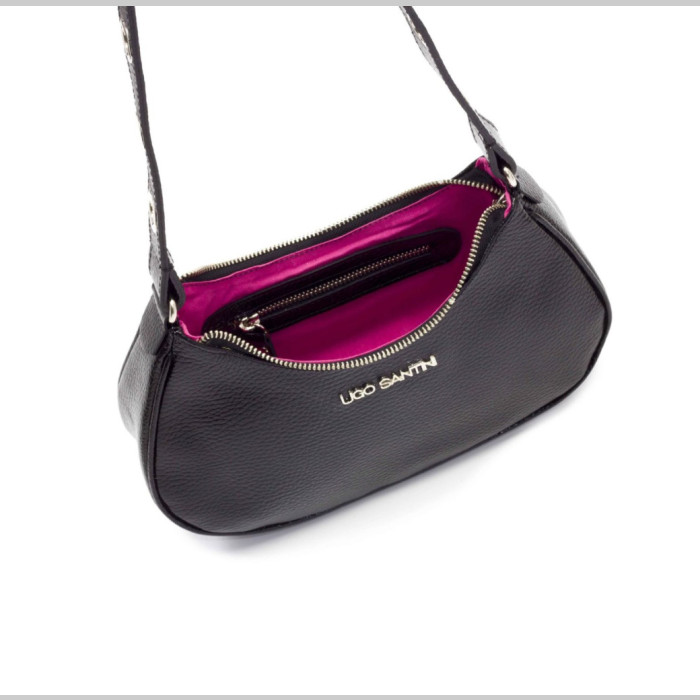 Cartera de cuero en folia plata, peltre , oro y negro . Asa larga de cuero para cruzar con ojalillos. Herrajes nikel y oro. Forro: gross.