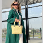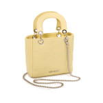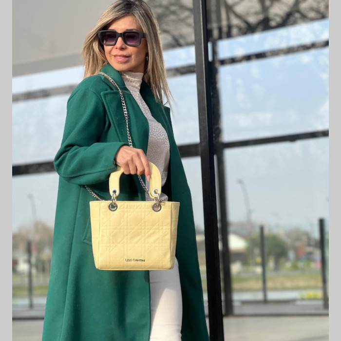 Cartera de napa de cuero vacuno bordada. Cierre con solapa con iman. Bolsillo en su interior. Asa corta en cuero y extraible cadena dorada. Forro: Algodón 100%
